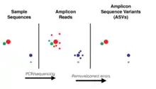 Amplicon sequence variant (ASV) is a term used to refer to single DNA sequences recovered from a high-throughput marker gene analysis. These amplicon reads are created following the removal of erroneous sequences generated during PCR and sequencing. This allows ASVs to distinguish sequence variation by a single nucleotide change. ASVs are utilized to classify groups of species based on DNA sequences, finding biological and environmental variation and to determine ecological patterns. For many years the standard unit for marker gene analysis was operational taxonomic units (OTUs), which are generated by clustering sequences based on a shared similarity threshold. These traditional units were created by construction of molecular taxonomic units by either clustering based on similarities between sequencing reads (de-novo OTUs) or by clustering reference databases to define and label an OTU (closed-reference OTUs). Instead of using exact sequence variants (single nucleotide changes), OTUs are distinguished by a less fixed dissimilarity threshold which is most commonly 3%. This means these units have to share 97% of the DNA sequence. ASV methods on the other hand are able to resolve sequence differences by as little as a single nucleotide change which allows this method the ability to avoid similarity-based operational clustering units all together. Therefore, ASVs provide a more precise measurement of sequence variation since this method uses DNA differences instead of user created OTU differences. ASVs are also referred to as exact sequence variants (ESVs), zero-radius OTUs (zOTUs), sub-OTUs (sOTUs), Haplotypes, or Oligotypes.[1] [2]
