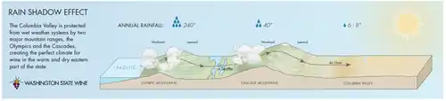The growing region lies close to the easternmost foothills of the Cascade Mountain range. A strong rain shadow effect gives the area one of the lowest precipitation rates[5] in the Columbia Valley.