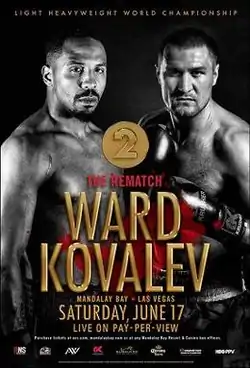 Andre Ward vs. Sergey Kovalev II, billed as The Rematch,[1][2] was a boxing superfight for the unified WBA, WBO, IBF, and vacant The Ring magazine light heavyweight titles between the top-two best pound-for-pound fighters in the world. Andre Ward won by an 8th round TKO.[3][4] The bout was held on June 17, 2017 in Las Vegas, Nevada and was televised on HBO Pay-per-view.[5][6][7]