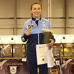 Andrea Arsović (Serbian Cyrillic: Андреа Арсовић, born 5 February 1987) is a Serbian sports shooter. She won a gold medal in the 10m air rifle at the 2015 European Games[2] and is also a two-time European champion in the same discipline as well as a three-time champion in mixed team and once in women's team. Arsović won a gold medal at the 2009 and 2018 Mediterranean Games. She competed in the Women's 10 metre air rifle and women's 50 metre three positions events at the 2012 Summer Olympics.[3][4]