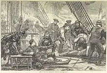 The incident was recalled two years later in the exchange of rhetoric at the battle of Flodden.[9] The story of the sea-battle was told by Raphael Holinshed and in other 16th-century English chronicles. In Holinshed's story the Howards at first pretended only to approach and salute Andrew Barton, but then engaged in battle, Barton's ship was the Unicorn and he died from his wounds. The Scottish survivors were taken to London and kept prisoner in the Bishop of York's lodging, York Place at Whitehall.[10] Edward Hall wrote that Andrew encouraged his men during the fight with his whistle. Hall mentions that the two ships were brought to Blackwall on 2 August 1511, and the prisoners were freed after an interview with the Bishop of Winchester, after acknowledging their piracy.[11]