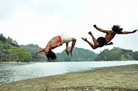 Angampora is a Sri Lankan martial art that combines combat techniques, self-defense, sport, exercise, and meditation.[1][2] A key component of angampora is the namesake angam, which incorporates hand-to-hand fighting, and illangam, involving the use of indigenous weapons such as the ethunu kaduwa, staves, knives and swords.[3][4] Another component known as maya angam, which uses spells and incantations for combat, is also said to have existed.[5] Angampora's distinct feature lies in the use of pressure point attacks to inflict pain or permanently paralyze the opponent. Fighters usually make use of both striking and grappling techniques, and fight until the opponent is caught in a submission lock that they cannot escape. Usage of weapons is discretionary. Perimeters of fighting are defined in advance, and in some of the cases is a pit.[5][6]
