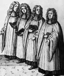 Almost all Anglican church music is written for choir with or without organ accompaniment. Adult singers in a cathedral choir are often referred to as lay clerks, while children may be referred to as choristers or trebles.[8] In certain places of worship, such as Winchester College in England, the more archaic spelling quirister is used.[9]