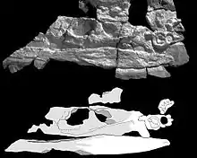 Despite its discovery during the 1980s, MPPL 18797 was only first thoroughly described by Andrea Cau and Federico Fanti in 2014, and was found to represent the first articulated skeleton of an Italian plesiosaurian. The large size of the skull compared to the rest of the skeleton, as well as the presence of a lacrimal bone, and a distinct front-side facing projection of the prefrontal into the orbital margin, allowed to easily identify the specimen as belonging to Pliosauridae.[2] The specimen was named in 2015 by Cau and Fanti following the preparation of additional bones, with the type species being Anguanax zignoi. The generic name is derived from Anguana, an aquatic creature with both fish and reptilian traits present in North Eastern Italian mythologies, and from anax, Greek for a lord, a "tribal and military leader". The specific name honors Zigno for discovering the first plesiosaurian remains from the Rosso Ammonitico Veronese Formation.[1]