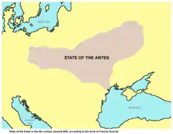 The Antes, or Antae (Greek: Áνται), were an early East Slavic tribal polity of the 6th century CE. They lived on the lower Danube River, in the northwestern Black Sea region (present-day Moldova and central Ukraine), and in the regions around the Don River (in Middle and Southern Russia).[1] They are commonly associated by scholars with the archaeological Penkovka culture.[2][3][4][5]