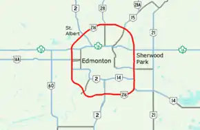 ![]() The Edmonton Metropolitan Region with Anthony Henday Drive highlighted in red | ||||