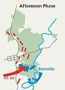 On the southeast side of town, Union Maj. Gen. Ambrose E. Burnside's XI Corps had been trying to cross Antietam Creek since mid-morning, being held up by only 500 Georgia sharpshooters. Around 1 p.m., they finally crossed Burnside's Bridge and took the heights. After a 2-hour lull to reform the Union lines, they advanced up the hill, driving the Confederates back towards Sharpsburg. But for the timely arrival of Maj. Gen. A.P. Hill's division from Harpers Ferry, Burnside would have entered Sharpsburg. Instead, the Union troops were driven back to the heights above the bridge.[20]