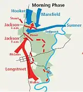 The Battle began at dawn on September 17, 1862, when Maj. Gen. Joseph Hooker began the Union artillery bombardment of the Confederate positions of Maj. Gen. Thomas J. "Stonewall" Jackson in the Miller cornfield. Hooker's troops advanced behind the falling shells and drove the Confederates from their positions. Around 7 a.m. Jackson reinforced his troops and pushed the Union troops back. Union Maj. Gen. Joseph K. Mansfield sent his men into the fray and regained some of the ground lost to the Confederates.[20]