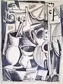 That persistent urge to draw that possessed Diego from a young child carried into Diego's last hours.[10] The second weekend of December there was an open house in Diego's home and studio; he was too weak to attend.[10] Yet he found the strength to draw one more piece for a door prize, his last work of art for the public,[34] a cubist, ink drawing; followed by a small pencil sketch for Helga.[10]