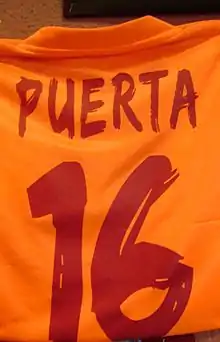 Sevilla subsequently retired Puerta's number 16 shirt, with the provision that should his son, Aitor Antonio (born 22 October 2007),[15] one day play for the club, he will have the option to bring the number out of retirement.[16] However, Spanish football teams were not allowed to do so, as the Royal Spanish Football Federation stated that clubs should use number 1 to 25 for their regular squad, with no additional room for manoeuvre; as a result, David Prieto wore the shirt in 2007–08 in honour of his friend[17] but it was later decided that only youth products could wear that jersey.[18]