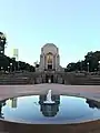 Another feature that was considerably altered was the landscaping. Dellit planned water gardens for either side of the memorial in the form of a narrow pool to the north and a cascading waterfall to the south. However, as the bulk of the building began to rise above the park, it became apparent that the scale of the water features needed to be increased to balance it. As a result, the cascades were eliminated and the pool extended to 170 feet (52 metres) long by 72 feet (22 metres) wide. Landscaping was completed by the City Council, which was responsible for the park. Finance for the additional work came from the state Unemployment Relief Fund and a large number of council employees and relief labourers poured the concrete for the pool in a single day to eliminate the need for joints and ensure that it was watertight. The Council acceded to Dellit's request to keep a clear open space around the memorial. It also followed his plan for a line of poplars on either side of the pool to symbolise the French battlefields. Dellit also wanted beds filled with the red poppies of Flanders and other plantings from the eastern and western fronts.[10][2]