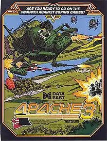 Apache 3 is a 3D scrolling shoot 'em up arcade game released by Tatsumi (and Data East in North America) in 1988. Players control a yellow AH-64 Apache helicopter with weapons and shoot everything in the air and on the ground.