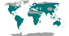 The Apodiformes evolved in the Northern Hemisphere. Eocypselus, a primitive genus known from the Late Paleocene or Early Eocene of north-central Europe, is somewhat difficult to assign; it is considered a primitive hemiprocnid.[5] This would suggest that the major apodiform lineages diverged shortly after the Cretaceous–Paleogene boundary. However, the perching adaptation of the foot of Eocypselus on which this theory rests may just as well be a symplesiomorphy. Most researchers believe that presently this genus cannot be unequivocally assigned to either the Apodiformes or the Caprimulgiformes. The Early Eocene Primapus, found in England, is similar to both a primitive swift and the aegialornithids, which are in some aspects intermediate between swifts and owlet-nightjars. Fossil evidence demonstrates the existence of swifts during that period in Europe. At that time, most of Europe had a humid, subtropical climate, possibly comparable to modern-day southern China. For a map of Early–Middle Eocene Earth, see the Paleomap project;[6] here note that both the Caucasus mountains and the Alps did not exist yet and aegialornithids were possibly present in North America.[7] By the late Eocene (around 35 MYA), primitive hummingbirds started to diverge from the related jungornithids; the Middle Eocene Parargornis (Messel, Germany) and the Late Eocene Argornis, found in today's southernmost Russia, belong to this lineage. Cypselavus (Late Eocene – Early Oligocene of Quercy, France) was either a primitive hemiprocnid or an aegialornithid.
