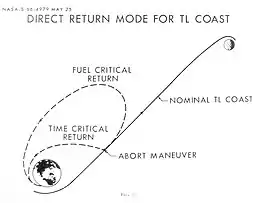 This depiction of a direct abort (from a 1966 planning report) contemplates returning from a point much earlier in the mission, and closer to Earth, than where the Apollo 13 accident occurred.