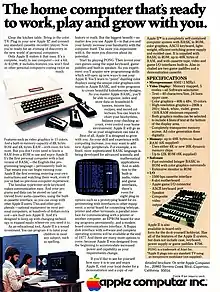 ![]() Apple II in a common 1977 configuration, with a 9" monochrome monitor, game paddles, and a Red Book-recommended Panasonic RQ-309DS cassette deck | |