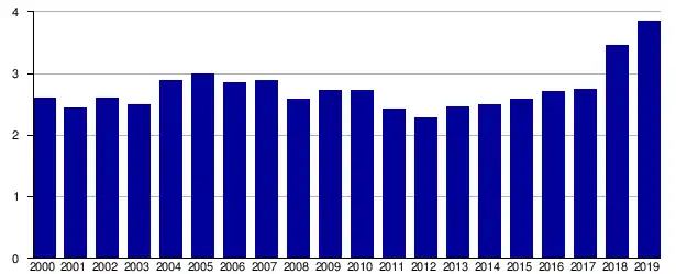 In 2019, the airport handled just over 762,000 passengers, the most in its history.[2]