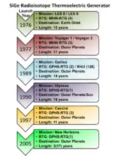 SiGe has been used as a material in RTGs since 1976. Each mission that has used RTG technology involves exploration of far-reaching regions of the solar system. The most recent mission, New Horizons (2005), was originally set for a 3-year exploration, but was extended to 17 years.