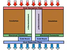 Near the sun, solar cell performance deteriorates from high incident particle flux and high temperatures from heat flux.[9] However, thermoelectric energy conversion systems that use thermoelectric materials (e.g. SiGe alloys) as a supplemental source of power for missions near the sun can operate unprotected in vacuum and air environments under high temperatures due to their low sensitivity to radiation damage.[9] Such properties have made SiGe thermoelectrics convenient for power generation in space. The multifoil cold stack assembly, composed of molybdenum, tungsten, stainless steel, copper, and alumina materials, provides the insulation between the electrical and thermal currents of the system. The SiGe n-leg doped with boron and SiGe p-leg doped with phosphorus act as the intermediary between the heat source and electrical assembly.