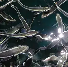 Their rapid growth rate in aquaculture, as well as the high quality of their flesh, makes cobia potentially one of the more important potential marine fish for aquaculture production.[3] Currently, cobia are cultured in nurseries and grow-out offshore cages in many parts of Asia and off the coast of the United States, Mexico and Panama. In Taiwan cobia weighing 100–600 grams are cultured for 1–1.5 years to reach the 6–8 kilograms needed for export to Japan. Currently, around 80% of marine cages in Taiwan are devoted to cobia culture.[2] In 2004, the FAO reported that 80.6% of the world's cobia production was by China and Taiwan.[4] After China and Taiwan, Vietnam is the third largest producer of farmed cobia in the world where production was estimated at 1500 tonnes in 2008.[2] The possibility is also being examined of growing hatchery reared cobia in offshore cages around Puerto Rico and the Bahamas.[5]