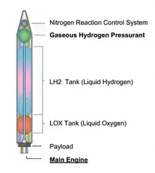 The vehicle was primarily intended for launching bulk products, like water, fuel, and other consumables, that are inexpensive to replace in the event of a launch failure. The target launch cost was $1 million. Aquarius was designed to be a single-stage vehicle 43 meters (141 ft) high and 4 meters (13.1 ft) in diameter and powered by a single pressure fed engine using liquid hydrogen and oxygen propellants stored in a composite pressure tank.[1] Launch would have taken place from a floating position in the ocean to minimize launch infrastructure with the ability to place a 1,000-kilogram (2,200 lb) payload into a 200-kilometer (120 mi), 52-degree orbit. The payload, located in the base of the vehicle, would be extracted by an orbiting space tug for transfer to its ultimate destination, like the ISS or a propellant depot, after which the vehicle would de-orbit and be destroyed.[2]