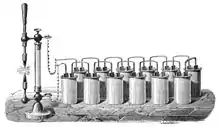 The concept of carbon-arc lighting was first demonstrated by Humphry Davy in the early 19th century, but sources disagree about the year he first demonstrated it; 1802, 1805, 1807 and 1809 are all mentioned. Davy used charcoal sticks and a two-thousand-cell battery to create an arc across a 4-inch (100 mm) gap. He mounted his electrodes horizontally and noted that, because of the strong convection flow of air, the arc formed the shape of an arch. He coined the term "arch lamp", which was contracted to "arc lamp" when the devices came into common usage.[4]