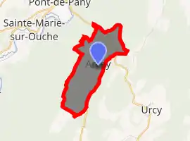 Arcey is located some 3 km south-east of Sainte-Marie-sur-Ouche and 16 km west by south-west of Dijon. Access to the commune is by the D35 road from Pont-de-Pany in the north-west passing through the north of the commune and continuing south-east to Urcy. The D104 road forms most of the eastern border of the commune as it branches south from the D35 and continues to join the D8 south of the commune. Access to the village is by the country road Rue des Ecrevisses which branches off the D35 in the north and passes south through the length of the commune and the village. The commune is heavily forested with some areas of farmland in the centre near the village.[2]
