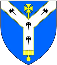 ![]() Arms of the Archbishop of Canterbury: Azure, an episcopal staff in pale or surmounted by a pall proper edged and fringed of the second charged with four crosses pattée fitchée sable | |
