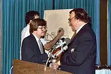 He won the 1992 "Bob Clampett Humanitarian" Eisner Award,[37] and was named Best Editor by the Eisners in 1993.[38] In 1998 he was entered into the Eisner Hall of Fame.[38] In 2008, he was one of two recipients of that year's Bill Finger Award, which annually honors one living and one deceased comics creator. The award was presented July 25, 2008, during the 2008 Will Eisner Comic Industry Awards ceremony at Comic-Con International.[39]