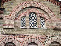 The main feature of the Tarnovo School of Architecture is the rich decorative ornamentation in exterior of the edifices. The technique that was used was called mixed construction in which belts of stone and bricks alternated with each other. That method was a heritage from the Roman architecture (opus mixtum) but in that case it had lost its initial constructive application and was used mainly with artistic purpose. The wide plaster fugues also had decorative purpose. The builder chose different types of stone (limestone, travertine, marble, granite), and the bricks had varied shape and dimensions and were put in different positions forming decorative ornaments and monograms. A cell type method was sometimes used in which each stone block was completely surrounded by bricks. The bricks were painted in red in order to increase the contrast. The facades of the churches were segmented by deep niches (often with two steps) decorated with flying buttresses and archvaults. Unlike the churches in Constantinople the niches from the Tarnovo School of Architecture do not respond to the interior (pseudo constructive niches) and were used for purely decorative purpose. As an additional decoration rows of clay circles and four-leaves glazed in green, brown, yellow or orange were used. The origins of that type of decoration are in the Arab architecture. The Nessebar churches "St John Aliturgetos" and "Christ Pantocrator" have especially sumptuous decoration.