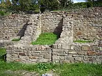 From the Second Bulgarian Empire there are basically two types of mass dwellings: semi-dug houses (semi dug-out) and overground houses. The semi-dug dwelling can be also divided into two types: evenly dug in (around 150 cm) and dug in inclined terrain, in that cases the rear was fully under the ground and the front was exposed. The first type was built with timber and covered with straw or reed. Similar dwellings were known from the First Bulgarian Empire too. The second type of houses were built of stones soldered with mud (in the parts over the ground) and the roof was made of timber. The depth of dug-in reached two meters and the door was from the exposed part. The floor was covered with bricks or plastered up with clay. A furnace was used for heating and the smoke came out from an opening on the roof. Such dwellings are found in the western slopes of Momina Krepost and on the slopes of the Tsarevets hill. These houses had a very slow evolution, their root were from 8th to 12th century and continued to be used during the period of the Ottoman domination.[3] A variety of that type are the semi-dug houses built entirely of stone which had a second floor. The most common type of houses in the Medieval Bulgarian towns were the overground houses. Their ruins have been found in Tarnovo, Shumen, Lovech, Cherven. They were usually with two storeys and one or two rooms. They were built on a previously leveled ground closely adjoining each other and were usually without yards. They were built of stones soldered with mud or plaster. The roof was probably made of timber. Their inhabitants were probably craftsmen or servants of the aristocracy. The ground floors were used for shops and workshops.