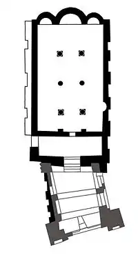 According to the number of naves the churches were one-naved (Church of St Demetrius of Thessaloniki, Veliko Tarnovo in the Asen's Neighbourhood, Tarnovo, Boyana Church), two-naved ("St Ivan of Rila" in Trapezitsa, Tarnovo) and three-naved (SS. Forty Martyrs Church in Tarnovo, "St Nicola" in Melnik). In the cruciform dome churches (Church of St John Aliturgetos and Church of Christ Pantocrator, both in Nessebar) the dome lied over four columns which were connected to the walls with arches. The altar was formed by a semicircular or polygonal apse. In some churches the altar was separated into three parts and the external ones (called bema and diakonnik) were used for safe-keeping of the church plates, garments and books. In that case there was usually a triple apse. The design was complicated by a pre-apse space. The vaults were semicircular and built of bricks. Some churches had outhouse parts such as galleries (SS. Forty Martyrs Church and "St Peter and Pavel" in Tarnovo), chapels (Boyana Church), ossuaries and others. The Church "St Virgin Maria of Petrich" in the Asenova krepost has two stories and the lower one served as an ossuary.[1]