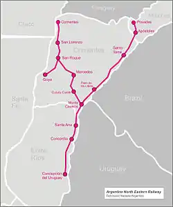 The Argentine North Eastern Railway (ANER) (in Spanish: Ferrocarril Nordeste Argentino, also Ferrocarril del Nord-Este Argentino) was a British-owned railway company, founded in 1887, that operated a 1,435 mm (4 ft 8 1⁄2 in) standard gauge railway network in the provinces of Entre Ríos, Corrientes and Misiones in Argentina. When the company was nationalised in 1948 it became part of the state-owned General Urquiza Railway.