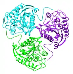 Arginase catalyzes the fifth and final step in the urea cycle, a series of biochemical reactions in mammals during which the body disposes of harmful ammonia. Specifically, arginase converts L-arginine into L-ornithine and urea.[2] Mammalian arginase is active as a trimer, but some bacterial arginases are hexameric.[3] The enzyme requires a two-molecule metal cluster of manganese in order to maintain proper function. These Mn2+ ions coordinate with water, orienting and stabilizing the molecule and allowing water to act as a nucleophile and attack L-arginine, hydrolyzing it into ornithine and urea.[4]