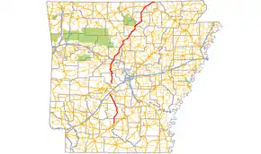 AR 9 begins at Crows and runs north, with AR 298 shooting east from the route.[7] Continuing north into Perry County, AR 9 meets AR 10 at Williams Junction with AR 216 detaching near Harris Rake. The route next meets AR 60 in Perryville before entering Conway County.[8] The route runs with AR 113 and AR 247 briefly south of Morrilton before meeting US 64 and I-40. AR 9 has a spur and business route in Morrilton. AR 915 strays from AR 9 near Overcup Lake. AR 9 also runs with AR 92 from Birdtown to Center Ridge in Conway County.[9] AR 9 concurs with US 65 from Choctaw to Clinton. The route continues to Shirley from Clinton with AR 16, where it is crossed by AR 110.[10] Entering Stone County, AR 9 runs north for several miles before meeting AR 66 in Mountain View. It exits town northbound with AR 5 and AR 16.[11] AR 9 arrows east in Izard County, passing AR 933, a former alignment of AR 9. The route mostly follows the White River in eastern Izard County. AR 9 detaches a spur route and meets AR 69 in Melbourne. The route then meets AR 56 in Brockwell before leaving the county.[12] The route enters its final county, meeting AR 395 before meeting US 62/US 412 and US 62 BUS in Salem. The route trails northeast to Mammoth Spring, where it meets US 63 and terminates, near the Missouri state line.[13]