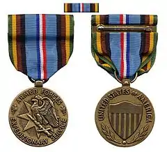 The obverse side of the medal consists of an eagle, with wings addorsed and inverted (representing the strength of the United States Armed Forces), standing on a sword loosened in its scabbard, and super- imposed on a radiant compass rose of eight points, (representing the readiness to serve wherever needed) all within the circumscription "ARMED FORCES" above and "EXPEDITIONARY SERVICE" below with a sprig of laurel on each side. On the reverse side of the medal is the shield from the United States Coat of Arms above two laurel branches separated by a bullet, all within the circumscription "UNITED STATES OF AMERICA".[2]
