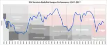 The 2017–18 season turned out easier. Having gathered 10 points out of the first four matches, Arminia hardly ever left the upper half of the league table (only at the 19th matchday: rank 10) and finished on the 4th rank – though in that season's very close league table this never meant much. In that season, Arminia also made a big step in lowering its debts through an alliance of sponsors.[20]