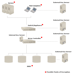The encryption of data can take place in many points in a storage network. The point of encryption may occur on the host computer, in the SAN infrastructure, the array controller or on each of the hard disks as shown on the diagram above. Each point of encryption has different merits and costs. Within the diagram, the key server components are also shown for each configuration of encryption. Designers of SANs and SAN components must take into consideration factors such as performance, deployment complexity, key server interoperability, strength of security, and cost when choosing where to implement encryption. But since the array controller is a natural central point of all data therefore encryption at this level is inherent and also reduces deployment complexity.