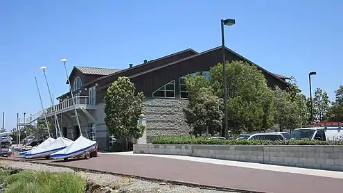 The modern Stanford Rowing and Sailing Center is located alongside Redwood Creek in Redwood City and was built in 2003 to replace older facilities.[9] It is a 16,500 square feet (1,530 m2) boathouse that cost US$5,000,000 to build. The building was designed by Hoover Associates and contains accommodation for both men's and women's crew and sailing with a second level with locker areas, exercise facilities, and a large function room.[10] The center also hosts many youth rowing and sailing groups, often sharing dock and launch space with the nearby Marine Science Institute.[11]