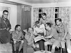 Blackburn stopped practising law in 1940,[1] and on 20 June was appointed to raise and command the 2/3rd Machine Gun Battalion, part of the Second Australian Imperial Force raised for service overseas during World War II.[59] He was one of only three Australian World War I VC recipients to volunteer for overseas service in World War II.[84] Eleven of the officers selected by Blackburn for his new unit were former officers of the 18th Light Horse (Machine Gun) Regiment, including the battalion second-in-command, Major Sid Reed, who was to prove valuable in moderating Blackburn's temper at times. The unit was raised in four different states; headquarters and A Company in South Australia, B Company in Victoria, C Company in Tasmania and D Company in Western Australia.[85] It concentrated in Adelaide on 31 October, after which Blackburn moulded the separately raised companies into one organisation. Multi-day route marches featured strongly in their training; Blackburn invariably marched at the front of his battalion.[86] After undergoing training, the battalion entrained for Sydney where it embarked on SS Ile de France on 10 April 1941. The battalion sailed for the Middle East via Colombo, where they had ten days' leave, and disembarked in Egypt on 14 May.[59][87] Upon arrival, the battalion was assigned to the 7th Division in Palestine, where it underwent further training[88] at a camp just north of Gaza.[89]