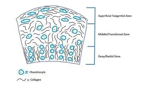 There are three structural zones in articular cartilage including a superficial tangential zone, a middle transitional zone and a deep zone. In the tangential zone, collagen fibers are aligned parallel to the surface and become gradually randomly aligned while moving into the deep zone. Collagen fibers in the superficial zone are aligned parallel to the surface in order to restrict shear stresses. Similarly, collagen fibers are aligned perpendicular to the surface in the deep zone in order to restrict compressive forces.[4] Between bone and the deep zone lies calcified cartilage. Cell arrangement also varies between the zones, in deeper zones chondrocytes are stacked into columns while in the superficial zones they are arranged randomly.[2] In the superficial regions the cells are also more elongated, while in deeper zones they are more spherical in nature.[4]