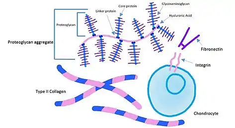 Extracellular matrix components of cartilage including proteoglycan aggregates, collagen, integrins and fibronectin. - Chondrocytes: Chondrocytes are the cells that produce and maintain the cartilaginous matrix. They are sparsely dispersed throughout cartilage and make up only about 2% of the total volume of cartilage.[4] Chondrocytes vary in size, shape and concentration depending on their location in articular cartilage.[4]