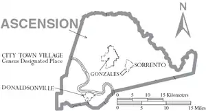Ascension Parish (French: Paroisse de l'Ascension, Spanish: Parroquia de Ascensión) is a parish located in the U.S. state of Louisiana. As of the 2010 census, the population was 107,215.[1] Its parish seat is Donaldsonville.[2] The parish was created in 1807.[3]