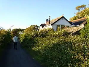 The station still stands, the trackbed through it is now part of the Lancashire Coastal Way and the platform is just visible from under the foliage.