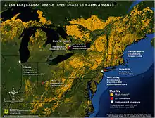 In North America, established populations were first discovered in August 1996 in Brooklyn, New York and has since been found in other areas of New York, New Jersey, Massachusetts, Illinois, Ohio, and Ontario in Canada.[3] However, it has also been eradicated from some regions within these states and provinces.[1][4][5][6][7][8] The first confirmed detection in South Carolina was June 4, 2020, at a residence in Hollywood, Charleston County. As a result both Clemson University's State Crop Pest Commission (which regulates crop pests for the state government) and the federal APHIS declared a quarantine.[9][10][11][12][13]