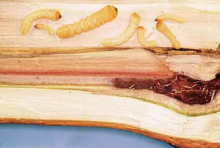 Larvae are cylindrical and elongate and can be 50 mm (2.0 in) long and 5.4 mm (0.21 in) wide. Larvae first create a feeding gallery in the cambial region, but more mature larvae tunnel to the heartwood as they feed. Larvae go through at least five instars over 1–2 years; which can vary due to host or temperature conditions. Larvae expel frass from their tunnels near the original oviposition site. A larva can consume up to 1,000 cubic cm of wood in its lifetime. Asian long-horned beetle larvae do not pupate before they reach a critical weight, so additional larval instars can occur.[1]