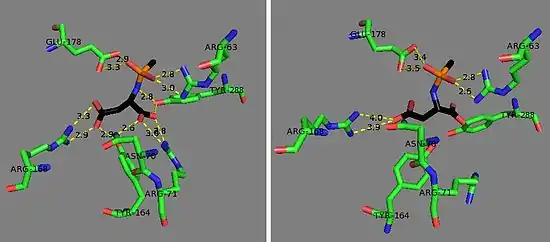 The zinc cofactor is found at the active site and is held by Glu-24, His-21, and His 116.[12] The substrate is held in place by Arg-63, Asn-70, Arg-71, Tyr-164, Arg-168, and Tyr-288.[5] The zinc cofactor is used to lower the pKa of a ligated water so that an attack on N-acetyl-L-aspartate may occur and to stabilize the resulting tetrahedral intermediate along with Arg-63, and Glu-178.[12]