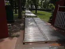 At about 9:20 a.m. Indian Standard Time, on 31 October 1984, Gandhi was on her way to be interviewed by British actor Peter Ustinov who was filming a documentary for Irish television. She was wearing a saffron saree with a black border, and accompanied by constable Narayan Singh, personal security officer Rameshwar Dayal and personal secretary, R. K. Dhawan.[5] She was walking through the garden of the Prime Minister's Residence at No. 1 Safdarjung Road in New Delhi towards the neighboring 1 Akbar Road office.[6]