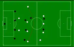 Football coaches and technical manuals such as Soccer Skills and tactics,[7] and The Soccer Coaching Bible,[8] often use visual symbols and diagrams to demonstrate the principles described above, and to link principles to historical games. The following examples combine technical coaching observations with championship play descriptions at the World Cup level as in Brian Glanville's World Cup, (1994).[9] The written descriptions are diagrammed for the reader to better understand various football tactics and skills as they are applied in the real world, at the highest levels.