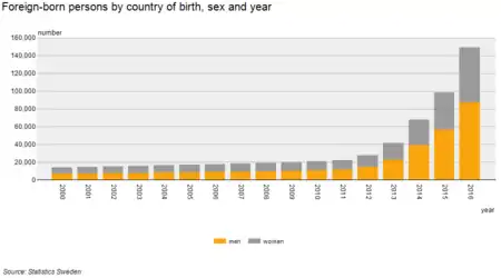 According to Statistics Sweden, as of 2016, there 22,663 are citizens of Iraq (12,705 men, 9,958 women) and 116,384 citizens of Syria (70,060 men, 46,324 women) residing in Sweden.[12]