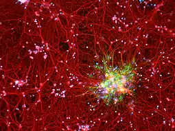 ![]() An astrocyte from a rat's brain grown in tissue culture and stained with antibodies to GFAP (red) and vimentin (green). Both proteins are present in large amounts in the intermediate filaments of this cell, so the cell appears yellow. The blue material shows DNA visualized with DAPI stain, and reveals the nucleus of the astrocyte and of other cells. Image courtesy of EnCor Biotechnology Inc. | |
